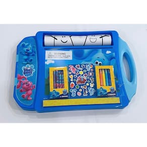 Mesa de arte rolante Blues Clues da Innovative Designs — Estojo artístico Blues Clues para crianças, atividades de colorir sem bagunça para crianças, papel artístico em rolo, lápis de cor, marcadores e adesivos — Mais de 20 peças —
