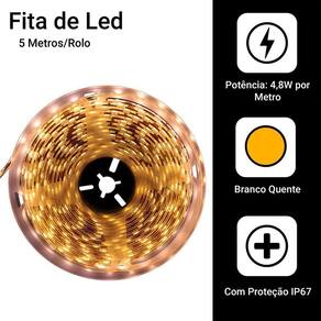 - Tensão: Fonte Bivolt (110~220v) Saida 12v - Potência: 8w por metro - Quantidade de Leds: 300 leds em 5 metros ou 60 leds por metro - Luminosidade: 720 Lúmens por metro - Vida Útil: 50.000 h - Temperatura de Trabalho: -20 a 50°C - Índice de proteção: IP65 - Cor: Branco Quente - Temperatura de Funcionamento: -20 a 50°C - Ângulo de Iluminação: 120° - Modelo SMD: 5050 - Resistência a Água: Sim - Comprimento: 5 m - Espessura: 0,25 cm - Largura: 0,9 cm - Material: Silicone