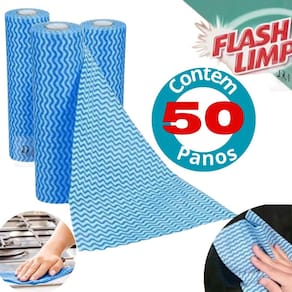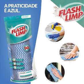 Rolo com Pano Azul Multiuso Flashlimp contém 50 panos. O Pano Azul Multiuso é eficaz na limpeza de diversas superfícies, proporcionando limpeza e brilho sem deixar resíduos de fiapos. É lavável, de secagem rápida, higiênico e não retém odores. O design permite que seja acomodado em suportes de cozinha e facilmente destacável. ==============Características============