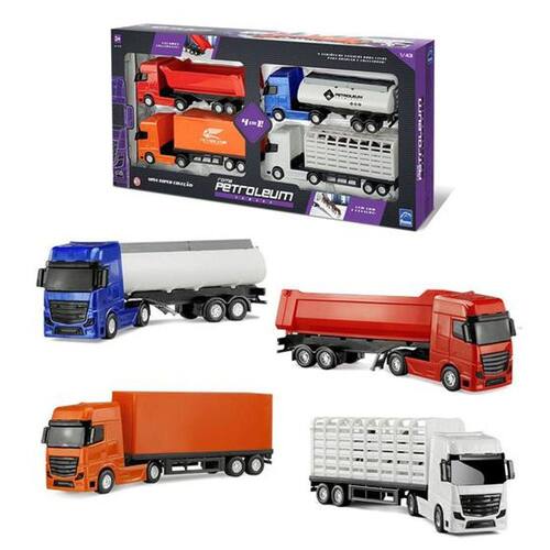 Uma super coleção! Com o sucesso da linha Roma Petroleum, chegou agora a versão séries! Vem com 4 cavalos e a Caçamba é inclinável. Vem com a versão Tanque, Caçamba, Baú e Haras. 4 versões de veículos roda livre para brincar e colecionar!.