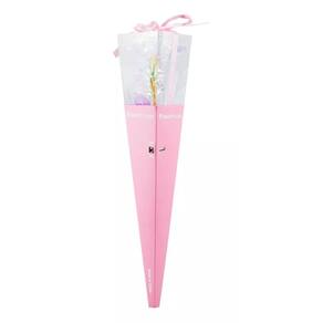 Rosa artificial na cor rosa com 36 x 7 cm de dimensão, envolto de luzes amarelos. Botão de ligar e desligar, ao ligar, pode manter a luz acesa constante ou piscando. Material: plástico; Funcionamento: 3 baterias LR44