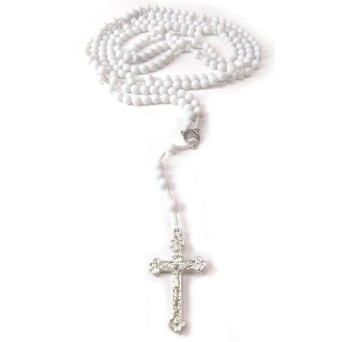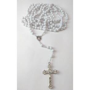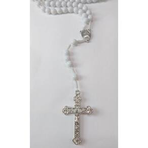 Rosário confeccionado manualmente com pedras acrílicas na cor branca de 8mm. Cruz ABS medindo 6,0 cm de altura. Rosário esticado: aproximadamente 100 cm, acomodado em saco de organza. O rosário contém os 20 mistérios correspondentes aos Mistérios Gozosos, Gloriosos, Dolorosos e Luminosos.