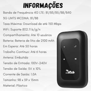 Roteador portátil internet móvel 4g e 5g lte recarregável Cor: preto você está pronto para uma conexão à internet estável e rápida em qualquer lugar que vá apresentamos o modem wifi 4g/5g lte recarregável de 150mbps, o parceiro perfeito para suas necessidades de conectividade em movimento. Com suporte para diversas bandas de frequência 4g lte b1/b3/b5/b8/b40 e 3g umts wcdma b1/b8 , este modem oferece velocidades de download de até 150 mbps, permitindo que você navegue na internet, transmita vídeos e faça chamadas de vídeo sem interrupções. com sua capacidade de compartilhar conexão com até 10 dispositivos simultaneamente e uma bateria de lítio de 2100 mah, que proporciona até 6 horas de uso contínuo e mais de 50 horas em espera, você nunca mais precisará se preocupar com a falta de internet. Além disso, o sistema inteligente integrado garante segurança e privacidade em suas conexões, enquanto a antena embutida garante um sinal de alto alcance em qualquer lugar que você esteja. não espere mais para desfrutar de uma internet rápida e estável em suas viagens, reuniões, festas e muito mais. Adquira agora o modem wifi 4g/5g lte e mantenha-se conectado onde quer que vá ------------------ Atenção ------------------ Cartão sim não incluso. ------------------ ------------------ é possível usar este modem como um roteador doméstico R: sim, você pode usar este modem como um roteador wifi em casa para compartilhar a conexão de internet com seus dispositivos. o modem vem com algum sistema de segurança integrado R: sim, o modem possui um sistema inteligente de segurança e privacidade para proteger suas conexões e dados. quais bandas de frequência 4g lte e 3g umts wcdma são suportadas por este modem R: este modem suporta as bandas de frequência 4g lte b1/b3/b5/b8/b40 e 3g umts wcdma b1/b8. quanto tempo dura a bateria deste modem em uso contínuo R: a bateria de lítio de 2100 mah oferece aproximadamente 6 horas de uso contínuo. é fácil configurar este modem para uso pela primeira vez R: sim, em seu dispositivo, abra as configurações de wifi e procure pela rede do modem. O nome da rede ssid e a senha estão impressos na parte onde você insere a bateria e o cartão sim. ambos podem ser alterados quando desejar quais são os benefícios de ter um modem recarregável como este R: um modem recarregável oferece a conveniência de usar a internet em movimento, sem a necessidade de uma tomada elétrica constante, sendo perfeito para viagens, acampamentos, reuniões externas e muito mais. ------------------ Especificações ------------------ Banda de frequência 4g lte: b1/b3/b5/b8/b40 3g umts wcdma: b1/b8 Taxa máxima: download de até 150 mbps Wifi: suporte 802.11 b/g/n Compartilhamento: até 10 usuários Bateria: bateria de lítio de 2100 mah Em espera: até 50 horas Trabalho contínuo: até 6 horas Antena: embutida Tensão de entrada: 100v-240v Tensão de saída: 5v 10% Corrente de saída: 1.0a Tamanho: 98 x 59 x 15mm Material: plástico ------------------ Conteúdo ------------------ 1x modem. 1x cabo usb. 1x manual. Anúncio referente a modem Acessórios que ambientam as fotos não inclusos. ------------------ Apresentação: ------------------ - qualidade garantida. - atendimento qualificado. - enviamos para todo o brasil. - compra garantida. - despachamos em até 1 dia útil após confirmação do pagamento Garantimos a devolução por arrependimento em até 7 dias, após o recebimento e de 15 dias contra defeitos de fabricação. Homologação Anatel: 080281811799 Marca: Não Informado