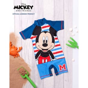 - CONJUNTO DISNEY MICKEY MOUSE E TRAJE DE BANHO LISTRADO — Com o adorado personagem Disney Mickey Mouse em contraste com um conjunto de roupas de banho azul e multicolorido, adorável para bebês e crianças.