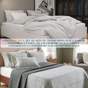 Roupa De Cama Tamanho Queen Box Nyla Kit Cobre Leito Estampado 200 Fios Avere Cor: Cinza Renove seu quarto com a sofisticação do Kit Nyla 200 Fios Transforme seu quarto com a elegância e o conforto que você merece Está cansado das roupas de cama que perdem a qualidade rapidamente e não oferecem o conforto que você deseja Pare de se frustrar com produtos de baixa qualidade Com o Kit Cobre Leito Nyla, você terá uma roupa de cama feita com 200 fios de puro algodão, estampada e com design de luxo, oferecendo durabilidade, conforto e um visual sofisticado para o seu quarto. Imagine deitar-se todas as noites em uma cama com uma roupa de cama super macia, de toque suave, que proporciona um sono tranquilo e confortável. Esse é o conforto e a elegância que o Kit Cobre Leito Nyla oferece para você Contém na embalagem: 01 Colcha 2,60m x 2,40m 02 Porta Travesseiros Estampados 70cm x 50cm Composição:tecido MICRO PERCAL 200 FIOS : 100% Poliéster 1. O que está incluído no conjunto O conjunto inclui um cobre leito dupla face, dois porta-travesseiros e um lençol com elástico. 2. Qual é a composição do tecido O tecido é de alta qualidade com 200 fios. 3. Como cuidar da Roupa de Cama Nyla Lave à máquina em ciclo suave com água fria e seque à sombra para manter a maciez e as cores. 4. O tecido é antialérgico Sim, o tecido é hipoalergênico, ideal para pessoas com pele sensível ou alergias. 5. Este conjunto é adequado para todas as estações Sim, o algodão respirável proporciona conforto térmico em qualquer estação do ano. 6. Qual é a de qualidade do produto Não perca a oportunidade de transformar suas noites com o conforto e a elegância da Roupa De Cama Tamanho Queen Box Nyla. Adquira já o seu kit e sinta a diferença Compre agora