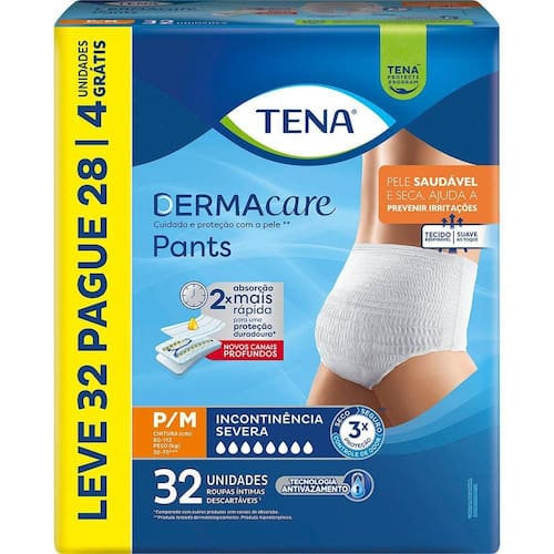 Benefícios e Diferenciais: Indicação: Incontinência urinária severa uso diurno e noturno Canais de absorção profunda: absorção rápida e eficaz, mantendo a pele seca Tecnologia antivazamento: barreiras protetoras e elásticos duplos nas pernas Controle de odores: neutraliza cheiros indesejáveis Material respirável e suave ao toque: conforto prolongado e proteção da pele Elásticos na cintura e pernas: ajuste anatômico e seguro Costuras laterais removíveis: facilitam a retirada do produto Veste como uma calcinha ou cueca descartável: mais discrição e liberdade de movimento A TENA Pants Dermacare é ideal para quem busca uma solução prática, confortável e eficaz para o dia a dia. Mais proteção, mais cuidado com a pele, mais qualidade de vida.