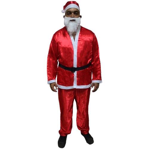 Características: Material: Cetim Poliéster Tecido Brilhante Cor: Vermelho e Branco 5 Peças (Gorro, Barba, Cinto, Calça e Paletó) Tamanho Único Calça Ajustável