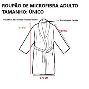 REF 615Roupão de Microfibra AdultoTamanho únicoPeso: 400 GramasPacote: 32/32/04Tamanho único largura - 75cm // Comprimento - 1,10 / Manga - 0,50cm Detalhe: Não tem bolsoAlça para pindurar Composição do Tecido:100 % PoliesterMicrofibraToque Super MacioRoupão desenvolvido em microfibra.O modelo possui a modelagem transpassada e faixa para amarração na cintura.Não possui bolsos.Essencial para quem não abre mão de conforto nos momentos de descanso.Roupão desenvolvido em microfibra macia de toque suave, ideal para o uso diário.