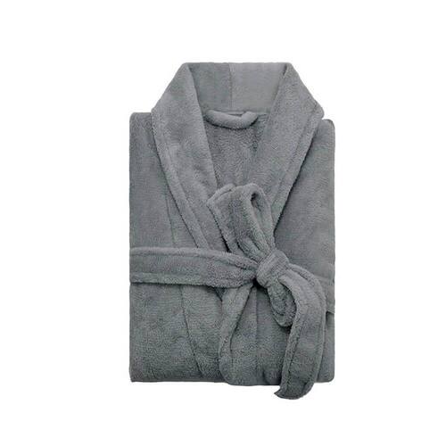 O roupão é feito em microfibra 100% poliéster na cor cinza e possui toque extremamente macio, aconchegante e confortável, ideal para todas estações do ano.
