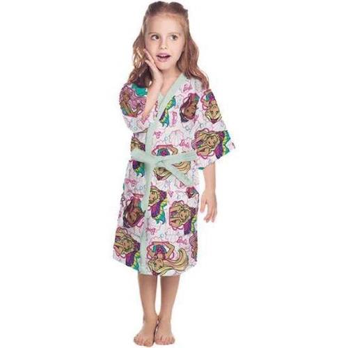 Roupão Felpudo Infantil Quimono Barbie Reinos Mágicos M O roupão felpudo da coleção Barbie carrega em sua estampa todo o encanto do fundo do mar, com sereias, conchas e muita magia. Com pala e cinto na cor verde, seu tecido apresenta a exclusiva qualidade Lepper da felpa que não desfia, possui ótima absorção e se torna mais macio a cada lavagem. A hora do banho ou saída da piscina dos pequenos, junto de sua personagem favorita, pode ser mais divertida, mais colorida, mais Lepper