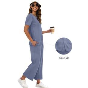 XIEERDUO Conjunto feminino de 2 peças, moda para viagem, fato de treino, confortável, pernas largas, para aeroporto, P-3GG, Azul, 2GG - Tecido leve como o ar/fluxo de ar ideal/elasticidade em 4 direções. As 2 peças são feitas com tecido espaçador leve, macio e ultra drapeado, projetado para parecer sedoso em sua pele. - Gola redonda básica/manga curta/blusa com fenda lateral. Esta túnica confortável é longa o suficiente para cobrir seus quadris, esconder sua barriga - Comprimento curto (9/10)/ Calça com cordão de cintura elástica/calça de moletom de perna larga. Calça com dois bolsos laterais práticos, ajuda a segurar seu celular, chaves, moedas e batons facilmente, pare de se preocupar com onde colocar seu telefone enquanto você está trabalhando/praticando esportes - Pode ser vestido por cima ou por baixo, ótimo para uso casual/vestir-se/férias/viagens/negócios casuais/trabalho/exercícios - Lavar à máquina em água fria, secar em temperatura baixa ou pendurar para secar. Passar a ferro em configurações baixas. A embalagem Acuum pode causar rugas na parte superior, mas lavar ou passar a ferro as refrescará
