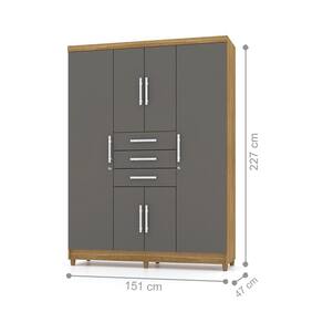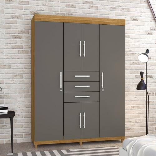 Produzido em MDP, 6 Portas, 3 Gavetas internas com corrediças metálicas., Cabideiro e calceiro em alumínio, Pés de madeira opcional na montagem.