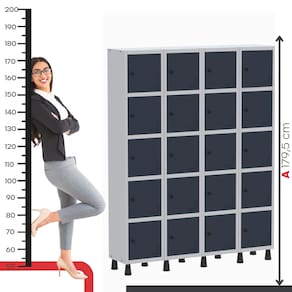 Com vinte portas individuais e sistema de ventilação, o roupeiro garante melhor circulação de ar, evitando odores e proporcionando mais conforto ao usuário. Seu design funcional é perfeito para vestiários de empresas, academias, comércios, escritórios e ambientes que exigem armazenamento seguro e organizado de objetos pessoais.