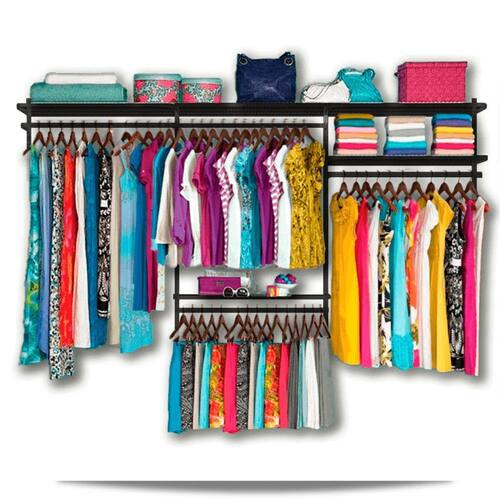 Este closet possui variações de altura dos cabideiros, próprio para roupas femininas cujo comprimento varia de modelo para modelo. Algumas prateleiras servem de apoio para caixas, bolsas ou roupas dobradas.
