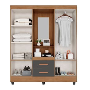 O Guarda-Roupa Capela Lite une elegância e praticidade em um só móvel. Versátil, possui quatro portas e duas gavetas, além de conter um compartimento aberto com espelho e prateleira, ideal para uso como penteadeira ou para expor objetos decorativos. Um design funcional que valoriza o ambiente com estilo.
