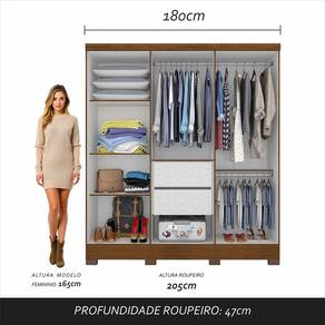 Detalhes Técnicos Medidas do Produto Montado: A: 205cm x L: 180cm x P: 47cm - MDP 12mm e 15mm - Acabamento em Pintura UV Texturizada - Acabamento Interno: Linho Fosco - Tonalidade: Freijó/Off Premium - Puxadores: MDF 18mm - Cabideiros: Em Alumínio - Gavetas com Corrediças Metálicas - Pés em Plástico ABS - Prateleiras e Gavetas suportam até 5kg distribuídos