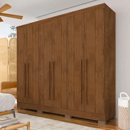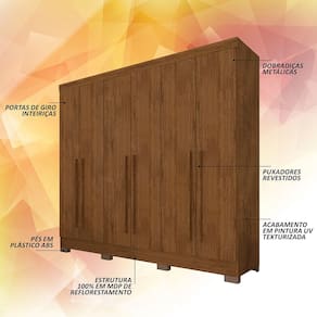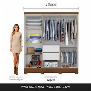 Detalhes Técnicos Medidas do Produto Montado: A: 205cm x L: 180cm x P: 47cm - MDP 12mm e 15mm - Acabamento em Pintura UV Texturizada - Acabamento Interno: Linho Fosco - Tonalidade: Freijó - Puxadores: MDF 18mm - Cabideiros: Em Alumínio - Gavetas com Corrediças Metálicas - Pés em Plástico ABS - Prateleiras e Gavetas suportam até 5kg distribuídos