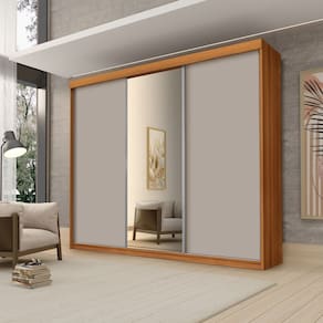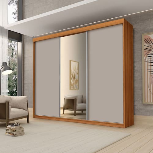 - Desenvolvido em 100% MDF de 15mm- Acabamento em UV- Possui 3 portas de correr- Possui 5 gavetas- Possui 9 prateleiras- Cabideiro em alumínio- Corrediças telescópicas- Trilho superior e inferior em alumínio- Roldanas das portas reforçadas - Espaços para vestidos longos- Puxadores perfil de alumínio- Acompanha espelho- Design moderno