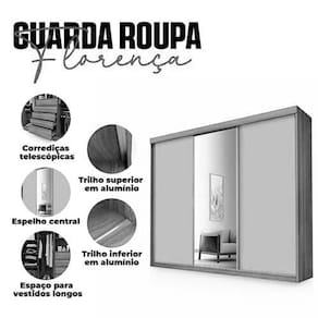 Começou a procurar móveis para seu quarto? Então apresentamos para você este belo guarda roupa da linha Florença. Possui um design moderno com três portas de correr, sendo a do meio com espelho. No interior conta com um ótimo espaço interno para acomodar vestidos longos. Com cinco gavetas, todas com corrediças telescópicas permitem uma abertura suave e completa. Desenvolvido em 100% MDF, é fabricado pela Luapa garantindo um acabamento refinado e pensado para otimizar o espaço e a organização do ambiente, além de dar um toque de elegância . Confira e aproveite! Características técnicas: