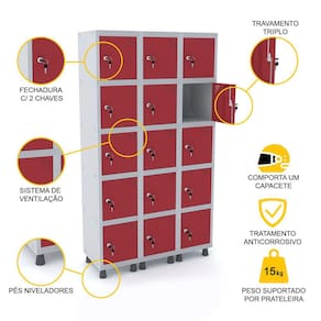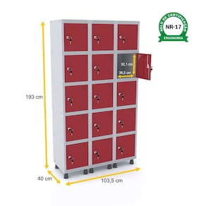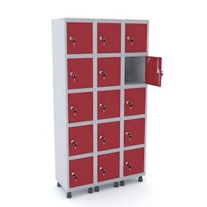 ROUPEIRO DE AÇO 3M 15 PORTAS FECHADURA PANDIN - CINZA/VERMELHO
