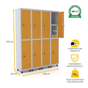 - Roupeiro de aço com 8 portas (uma para cada vão) e uma prateleira interna no meio de cada vão.