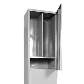 CONEXÃO OFFICERoupeiro confeccionado em chapa de aço de alta qualidade, com 02 vãos sobrepostos e 01 divisão vertical por vão, para separação das roupas (Sujas/Limpas). Sistema de ventilação através de venezianas, reforço nas portas e cabideiro. Fechadura CHAVE. Tratamento fosfatizante anticorrosivo e pintura eletrostática. Ideal para academias, surpermercados, empresa e para uso geral. Produzido em aço chapa 26 0,45mm de alta qualidade com tratamento anti-ferruginoso, o acabamento em sistema de pintura eletrostática a alta temperatura epóxi, tambem garante maior durabilidade da cor e resistencia a ferrugem. Possui 2 portas com venezianas para ventilação, compartimentos de tamanhos médios independentes sem divisórias internas, que garante que você consiga armazenar itens como bolsas, mochilas e entre outros. O fechamento das portas é através de CHAVE. Características- Quantidade de Portas: 2- Cor: Cinza Padrão- Chapa: 26 / 0,45mm- Sistema de Ventilação: Veneziana- Fechamento: CHAVE- Quantidade de cabides por porta: 2- Pés removíveis: Não- Desmontável: Não ( Exceto portas que podem ser trocadas ).- Pintura: Epóxi Pó - PORTA: BRANCO - CORPO: CINZAALTURA: 197cmLARGURA: 50 cmPROFUNDIDADE: 40 cmPESO: 30kgGARANTIA: 1 Meses Especificação de chapa e acabamento: Roupeiro produzido em chapa de aço tratada com antiferruginoso por fosfatização e pintura epóxi-pó por processo eletrostático.