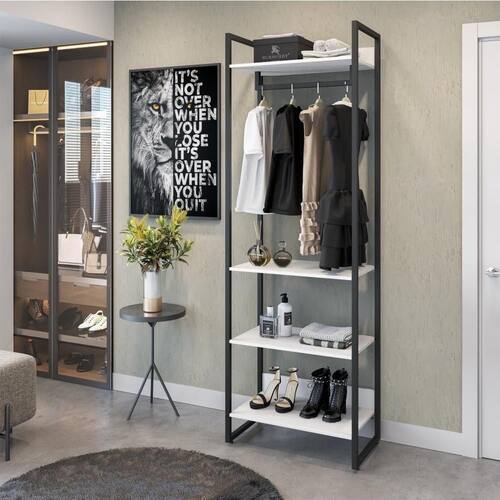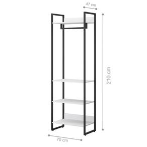 Além de ser produzido em MDP BP - 15mm, o Guarda Roupa possui, 4 prateleiras 15 mm , Estrutura Metálica ( Pintura EpóxiPreto ), com Sapatas Niveladoras e Cabideiro.