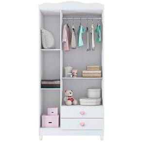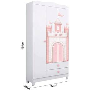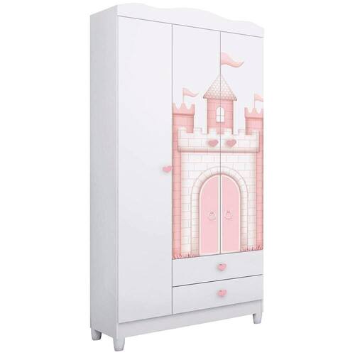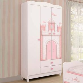 O Guarda Roupa Sophia é a escolha ideal para o quartinho da sua filha. Produzido em MDF 12mm e MDP 12mm, e acabamento em pintura UV (Brilho) atóxica. Possui 03 portas com dobradiças metálicas, cabideiro em alumínio, prateleiras com amplo espaço interno que possibilita a praticidade na organização de roupas e acessórios no dia a dia, 02 gavetas com corrediças metálicas, puxadores em poliestireno temático de corações e pés em poliestireno incluso. Seu diferencial são as 02 portas que possuem impressão digital temática que levam a criança a criar em sua imaginação o mundo do castelo da princesa. Perfeito para você que busca qualidade e um design moderno e temático para compor o quarto de sua filha.