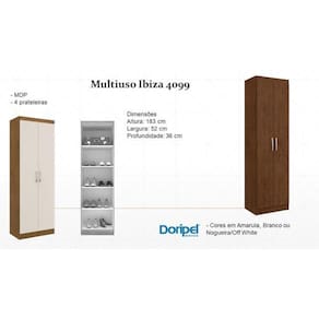 Ibiza 4099 MOVEIS DORIPEL Material MDP Diemnsões:Altura (cm) 183Largura (cm) 52Profundidade (cm) 36 Peso Real Suportado (Kg) 5kg Faixa de Peso Suportado (Kg) Até 40 Dimensões aproximadas da embalagem c/ produto (AxLxP) 183X35X11 02 portas de bater Número de Compartimentos (Nichos) 5 Número de Prateleiras 4 Capacidade (Pares de Sapato) Aproximadamente 12 pares Peso da embalagem c/ produto (kg) 28kg SAC do Fabricante: assistencia@doripel.com.br Atenção! Confira as dimensões deste produto e certifique-se de que passará normalmente por supostos elevadores, portas, escadas e/ou corredores de sua moradia; As imagens são ilustrativas, eletrodomésticos e demais objetos que compõem o cenário, não fazem parte do anúncio; Sobre a tonalidade das cores, poderá ocorrer alterações conforme a configuração do seu monitor. Orientamos que a montagem e instalações do produto seja realizado por um técnico de sua confiança, após a sua entrega. Não nos responsabilizamos pela instalação/montagem. Fornecemos somente assistências, por defeitos de fábrica. Fornecemos opções de Retirada na nossa loja Saimys moveis na avenida Ragueb Chohfi para não haver custo de envio.