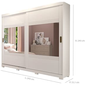 O produto e produzido 100 em MDF, possui 2 portas de correr, que dispoem de sistema com regulagem para mais suavidade na hora de fechar as portas. Alem de 4 gavetas internas super espacosas, 3 cabideiros para pendurar suas pecas. E o melhor, conta com um espaco exclusivo para guardar seus sapatos, colchas ou o que preferir.