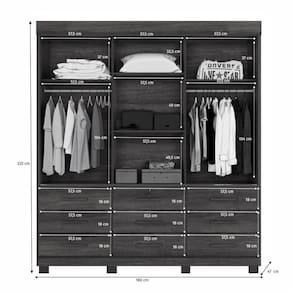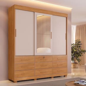 Internamente, conta com 9 gavetas com corrediças telescópicas, que proporcionam abertura leve e silenciosa sendo 1 delas com chave, ideal para guardar itens pessoais com . Possui ainda 4 prateleiras bem distribuídas e cabideiro em alumínio, perfeito para acomodar roupas de forma organizada.