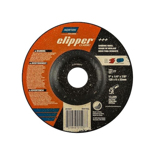 Trabaje de manera eficiente con esta rueda de esmeril Clipper Classic tipo A AO 27, que ofrece un rendimiento rentable con un precio inicial bajo. Su diseño equilibrado y vinculación suave brindan una combinación de resistencia y flexibilidad para una tasa de corte sólida y una larga vida útil de la rueda. Instale esta rueda abrasiva de óxido de aluminio en su esmeriladora angular para un uso consistente en aleaciones, aceros y metales ferrosos. El centro deprimido de 0,64 cm de espesor está diseñado para trabajar a un ángulo de 30°, ideal para biselar, alisar y remover material manualmente. - Abrasivo de óxido de aluminio de calidad que proporciona un rendimiento de molienda constante en aleaciones, aceros y metales ferrosos a un precio competitivo. - Nuestra mezcla ideal de resistencia de la rueda y unión suave ofrece un buen equilibrio entre tasa de corte y durabilidad. - Rueda de centro deprimido de 0,64 cm de espesor diseñada para usarse a un ángulo de 30° en una esmeriladora angular, ideal para remoción manual de material, alisado de soldaduras y biselado en la base/frente de la rueda. - Precio inicial bajo, ideal para usuarios finales que no pueden medir el rendimiento.