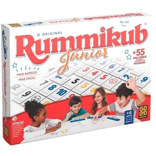 O Jogo Rummikub Júnior Grow é perfeito para as crianças se divertirem e desenvolverem suas habilidades. Com ele, os participantes precisam formar sequências numéricas da mesma cor, utilizando as peças do suporte e as peças já baixadas na mesa. A atenção é fundamental para vencer! O jogo acompanha 4 suportes, 44 fichas cartonadas e 50 fichas-ponto. Pode ser jogado por 2 a 4 jogadores, sendo recomendado para crianças maiores de 7 anos. Garanta o seu agora mesmo e proporcione momentos de diversão e aprendizado! Ean: 7908010135138