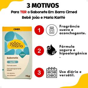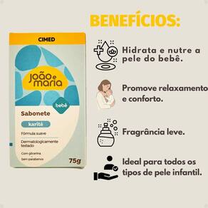 Sabonete Em Barra Cimed Bebê João e Maria Karité 75g O Sabonete Em Barra Cimed Bebê João e Maria Karité 75g foi desenvolvido para limpar delicadamente a pele sensível do bebê, proporcionando suavidade e proteção. Com fórmula enriquecida com manteiga de karité, o sabonete hidrata enquanto limpa, ajudando a preservar a barreira natural da pele. Seu cheirinho suave e agradável deixa o banho mais confortável e cheio de carinho, tornando-se um cuidado essencial na rotina do bebê.