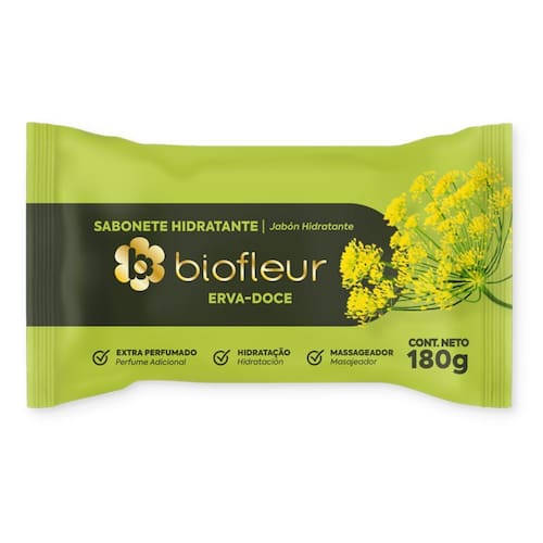 Sabonete Hidratante Biofleur Erva-Doce Sabonetes perfumados com extratos vegetais variados que promovem espumação cremosa e contribui para a hidratação da pele. Os Sabonete em barra de 180g têm exclusivo formato massageador e está disponível em 8 fragrâncias vibrantes.