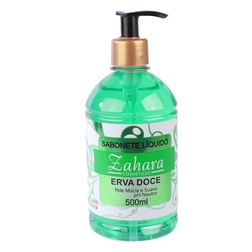 Sabonete Líquido 500ml Erva Doce com Válvul - Sabonete líquido Zahara para as mãos, proporcionando limpeza e refrescância; - Hidrata e perfuma suavemente, com pH neutro; - Embalagem com válvula (pump);\nMarca : ZAHARA Tipo de material : Aqua, parfum Cores ou Estampa : Verde Dimensões do Produto : 18 X 7,5 X 7,5 CM Dimensões da Embalagem : 18 X 7,5 X 7,5 CM Peso Bruto (Gramas) : 0.568