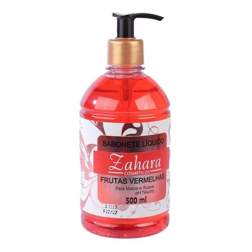Sabonete Líquido 500ml Frutas Vermelhas Vál - Sabonete líquido Zahara para as mãos, proporcionando limpeza e refrescância; - Hidrata e perfuma suavemente, com pH neutro; - Embalagem com válvula (pump);\nMarca : ZAHARA Tipo de material : Aqua, parfum Cores ou Estampa : Vermelho Dimensões do Produto : 18 X 7,5 X 7,5 CM Dimensões da Embalagem : 18 X 7,5 X 7,5 CM Peso Bruto (Gramas) : 0.564