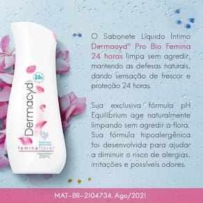 Sabonete Líquido Íntimo Dermacyd Femina 200ml Sensação de proteção e frescor o dia inteiro, todos os dias. Para ficar protegida e tranquila 24 horas, você conta com o sabonete íntimo Dermacyd pro•bio.