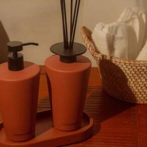 Com generosos 500ml de essência, este porta sabonete líquido tem embalagem fosca na cor Terracora que não descasca e válvula preta.