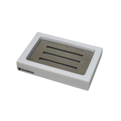 Ideais para manter a bancada organizada e sempre decorada, as saboneteiras de mesa permitem o uso do seu sabonete preferido sempre à disposição e combinam com diferentes estilos de ambientes. Características Gerais - Material: Resina de Poliéster e Metal (Inox e Latão). - Suporte de Metal. - Cor: Branco. - Altura: 2,5 cm. - Largura: 13 cm. - Comprimento: 10 cm. Marca: RESIMETAL