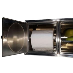 A saboneteira conjugada com papeleira de embutir de aço inox, aço 304 é forjada com o mais nobre metal, não enferruja, não oxida e tem uma grande resistência a intemperes. Com portas duplas independentes protege o papel higiênico de umidade direta e poeira, conservando o papel mais higiênico.
