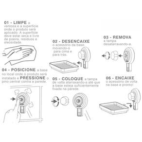 Descrição: A saboneteira possui canaletas em alto relevo para que o sabonete não tenha contato com a água. E se ficar água na saboneteira, ela é facilmente removível para fazer o escoamento. O sistema de instalação com ventosa dispensa o uso de ferramentas, os furos e a sujeira. Utiliza a sucção a vácuo para fixar o produto de forma rápida e prática. A ventosas da future são extrafortes e, neste produto, possue capacidade de suportar até 0,5kg.
