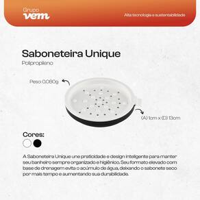 Saboneteira Unique une praticidade e design inteligente para manter seu banheiro sempre organizado e higiênico. Seu formato elevado com base de drenagem evita o acúmulo de água, deixando o sabonete seco por mais tempo e aumentando sua durabilidade.