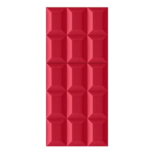Embalagem: Frasco de 75ml com borrifador, design em forma de barra de chocolate rosa, reciclável.