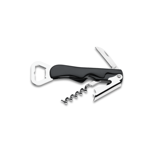 O Abridor de Garrafas/Saca Rolhas Veneza é multifuncional: corta cápsulas, saca-rolhas e abre garrafas.
