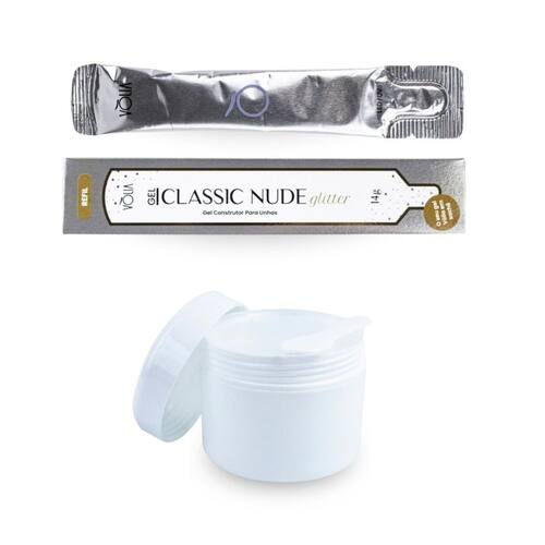 Contém: 01 - Sachê refil gel construtor Classic Nude Glitter, 14g, Vlia; 01 - Pote branco reutilizável com tampa, 30g; 01 - Vedação encaixável para ser colocada antes da tampa; 01 - Colher plástica que pode ser armazenada por cima da vedação.