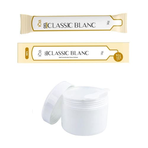 Contém: 01 - gel sachê classic blanc refil unhas alongamento led/uv 14g, vlia 01 - pote branco com tampa 01 - vedação encaixável antes da tampa 01 - colher plástica que pode ser armazenada por cima da vedação