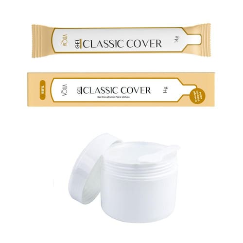 Contém: 01 - Gel Sachê Refil Unhas Classic Cover Alongamento LED/UV 14g, Vòlia 01 - Pote Branco com tampa 01 - Vedação encaixável antes da tampa 01 - Colher Plástica que pode ser armazenada por cima da vedação
