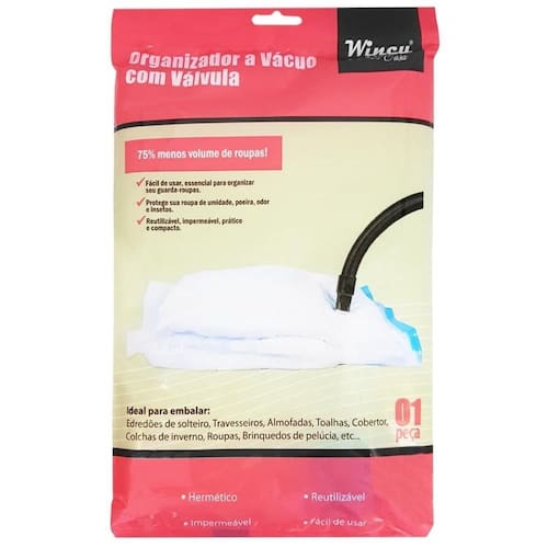 Organizador a vácuo com válvula é a solução ideal para quem busca armazenar e organizar objetos de forma fácil, rápida e inteligente. Produzido em polietileno transparente que facilita a visualização do que há em seu interior.