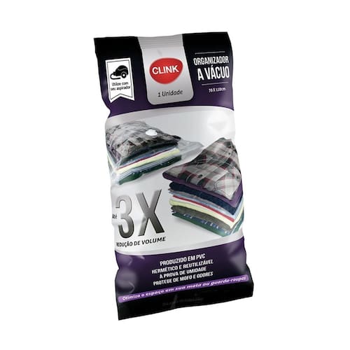 O saco a vácuo é uma escolha inteligente para melhorar a sua vida. Aumenta o espaço de armazenamento, pois reduz o volume das peças e ainda protege suas roupas e objetos contra umidade, mofo, bolor, sujeira, odores e insetos. Pode ser várias vezes sem perder o seu poder de vedação ou compressão. Fácil de utilizar, basta encaixar um aspirador de pó na válvula do saco e sugar o ar, e está pronto para guardar. Especificações: material: plástico transparente dimensões: 70 x 110 cm